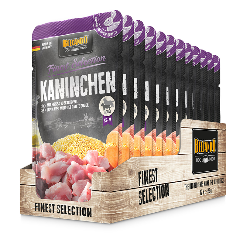 Ausgezeichnetes Rezept im praktischen Beutel. Saftiges Fleisch mit raffinierten Zutaten, schonend gegart im Frischebeutel. Kaltgepresstes Distelöl liefert essentielle Fettsäuren. BELCANDO® FINEST SELECTION eignet sich hervorragend für empfindliche oder wählerische Hunde, da es sehr gut verdaulich und schmackhaft ist. BELCANDO® Super Premium Nassfutter, das aus den besten natürlichen Produkten hergestellt wird, ist frei von Aroma-, Farb- und Konservierungsstoffen. Erhältlich im 125 g und 300 g Frischebeutel.