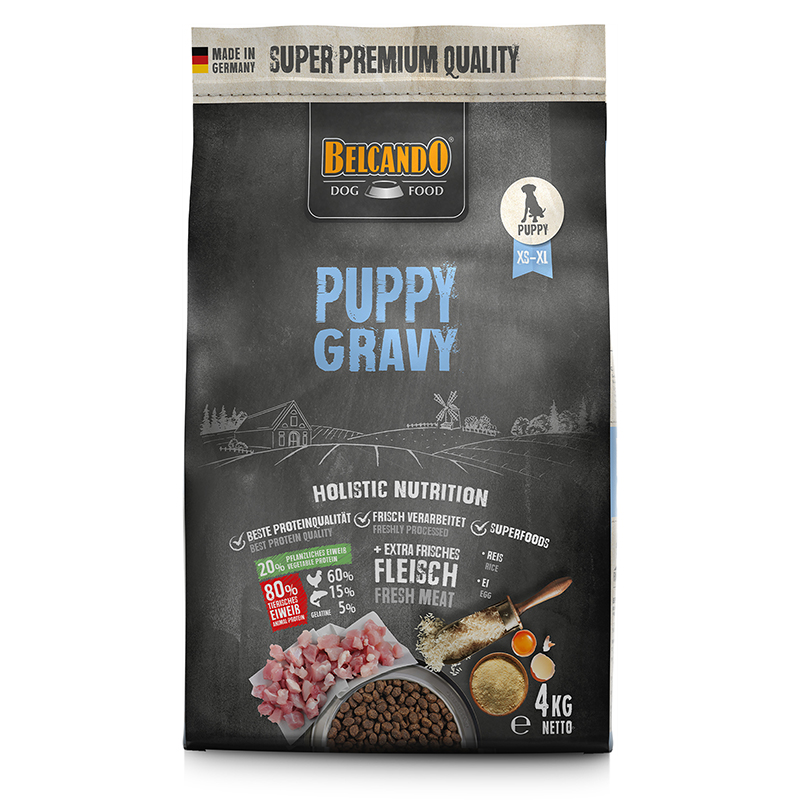 Mit erlesenen Rohstoffen, reich an Geflügel, Reis und Ei, ist BELCANDO® Puppy Gravy, besonders leicht verdaulich.