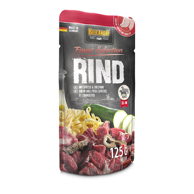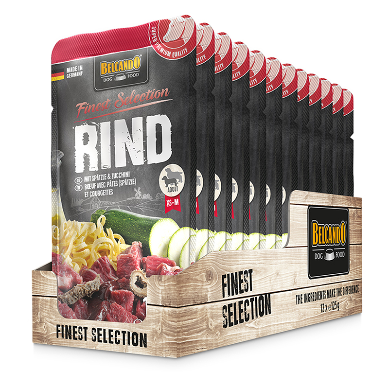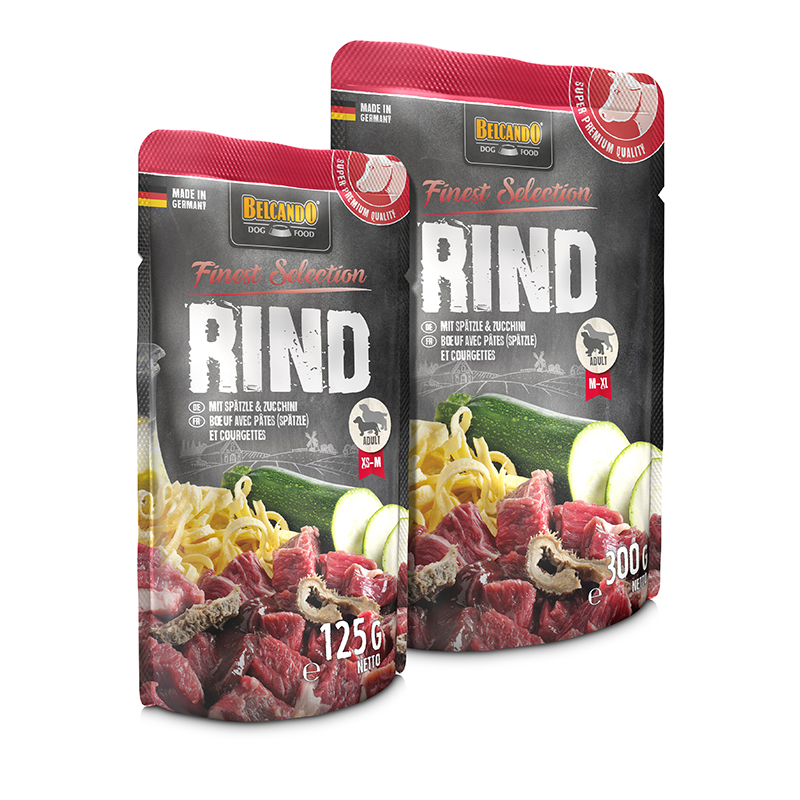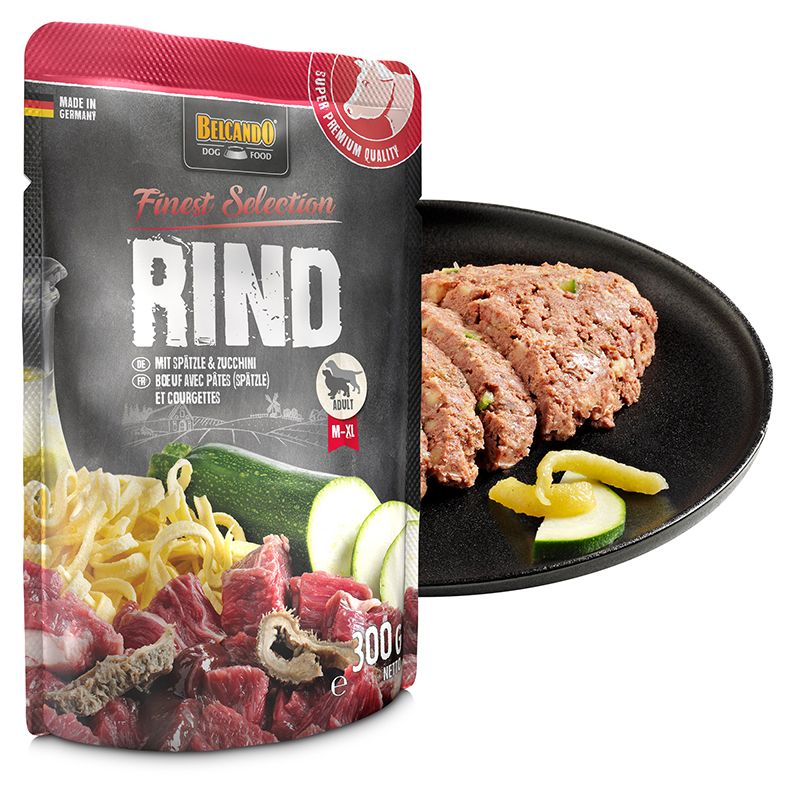 Ausgezeichnetes Rezept im praktischen Beutel. Saftiges Fleisch mit raffinierten Zutaten, schonend gegart im Frischebeutel. Kaltgepresstes Distelöl liefert essentielle Fettsäuren. BELCANDO® FINEST SELECTION eignet sich hervorragend für empfindliche oder wählerische Hunde, da es sehr gut verdaulich und schmackhaft ist. BELCANDO® Super Premium Nassfutter, das aus den besten natürlichen Produkten hergestellt wird, ist frei von Aroma-, Farb- und Konservierungsstoffen. Erhältlich im 125 g und 300 g Frischebeutel.