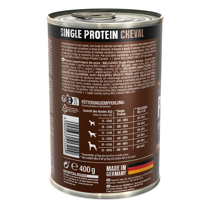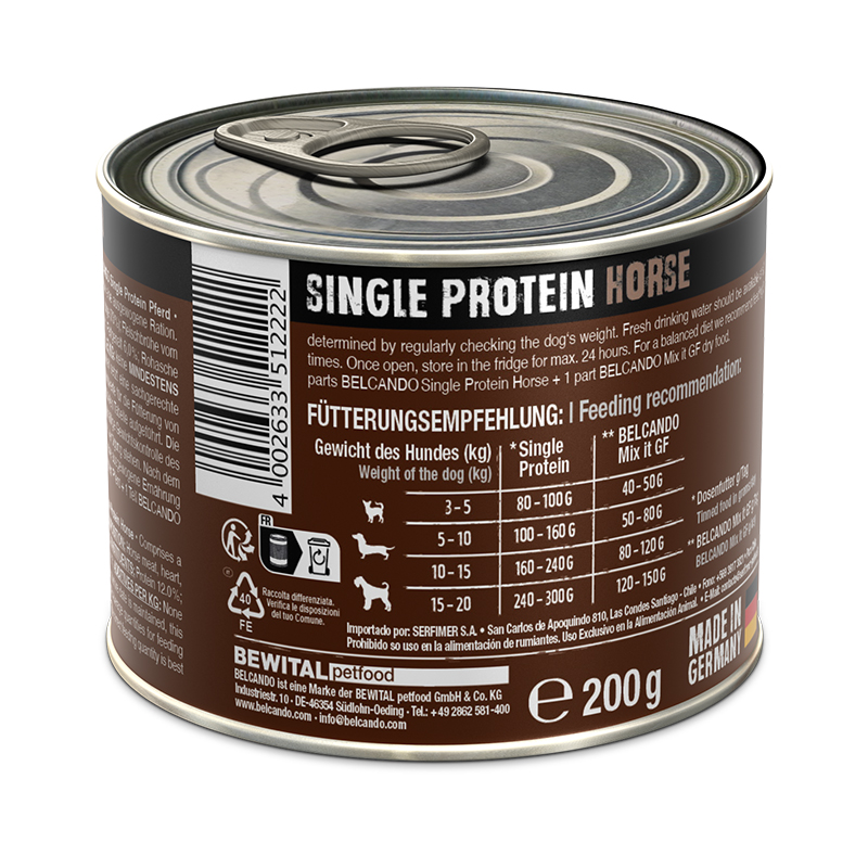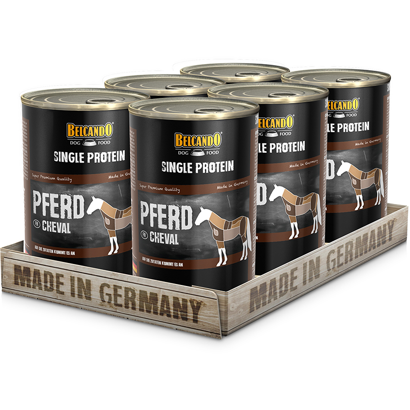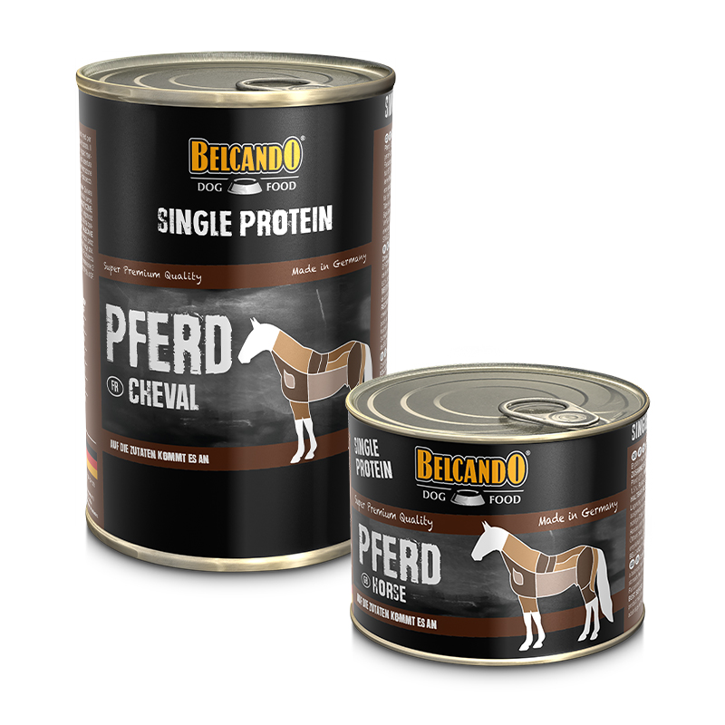 Erhältlich in 6 Fleischsorten ohne Zusatzstoffe, die in Kombination mit dem Ergänzungsfuttermittel BELCANDO® Mix it GF zur Diagnose (Eliminationsdiät) und auch täglich bei Futtermittelunverträglichkeiten eingesetzt werden können.