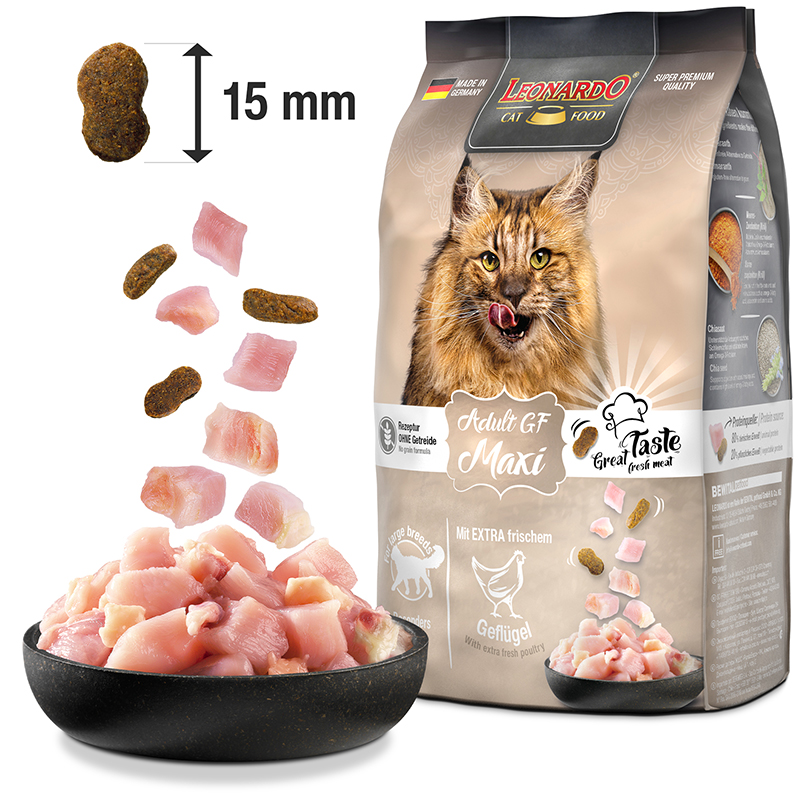 Die großen Maxi-Kroketten beschäftigen die Katzen länger bei der Nahrungsaufnahme und wirken sich so positiv auf die Zähne aus.