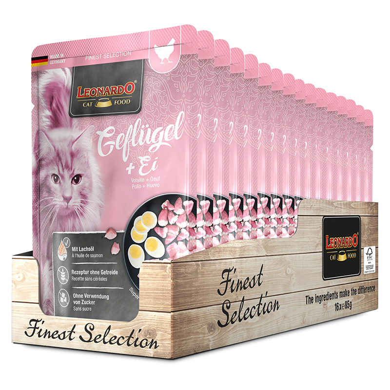 Geflügel: Fleisch, Herz, Leber (60 %); Fleischbrühe von Geflügel, Rind (28,3 %); Rinderlunge (6,5 %); Vollei (4 %); getrocknete Eierschalen (0,5 %); Mineralstoffe (0,5 %); Lachsöl (0,2 %).