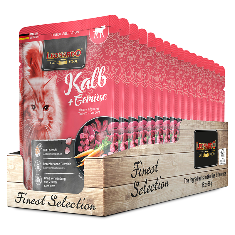 Kalbsherz, -lunge, -niere (36,5 %); Geflügel: Fleisch, Herz, Leber (30 %); Fleischbrühe aus Kalbfleisch, Geflügel (28,3 %); Karotten (4 %); getrocknete Eierschalen (0,5 %); Mineralstoffe (0,5 %); Lachsöl (0,2 %).