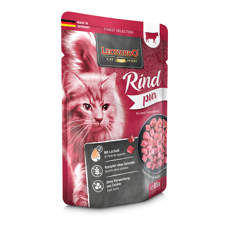Rind: Fleisch, Herz, Lunge, Leber, Niere (70 %); Rindfleischbrühe (28,8 %); getrocknete Eierschalen (0,5 %); Mineralstoffe (0,5 %); Lachsöl (0,2 %).